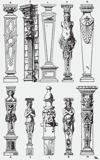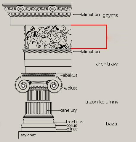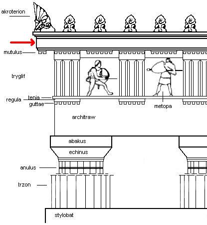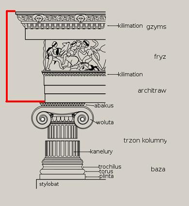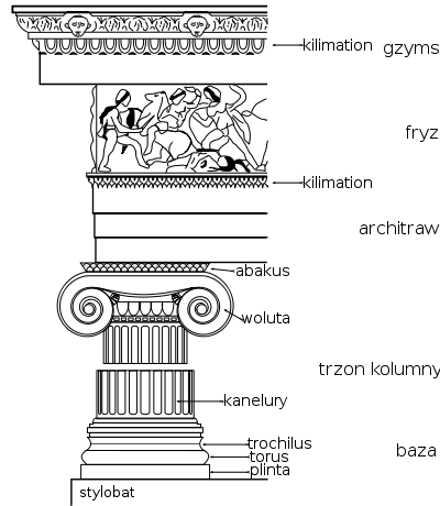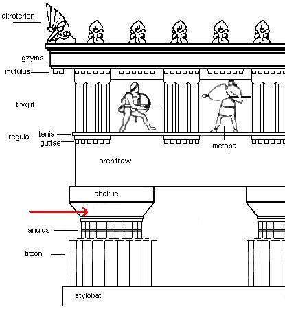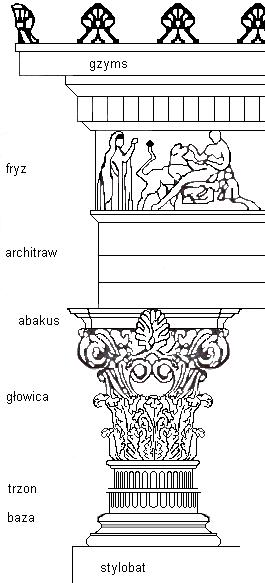 abakus, agora, akant, akropol, akroterion (naszczytnik), amazonomachia, amfiteatr, amfora, anthemion, anty, architraw, astragal, attyka, baza, belkowanie, cela (naos), centaur, centauromachia, chryzelefantyna, echinus, enkaustyka, entasis, figura serpentinata, fryz, gigantomachia, gimnazjon, gzyms, herma, hydria, jajownik (wole oczy), kanelury, kapitel, kariatydy, kimation, kolumnada, kontrapost, kora, krater, krepidoma, kuros, lekyt, meander, metopa, mimetyzm, mit, monopteros, naos (cela), naszczytnik (akroterion), palmeta, porządek architektoniczny, porządek dorycki, porządek joński, porządek koryncki, półkolumna, propyleje, skarbiec, stela, stylobat, teatr, terakota, tryglif, trzon, tympanon, waza, waza dipylońska, wole oczy (jajownik), woluta, złoty podział (złote cięcie)